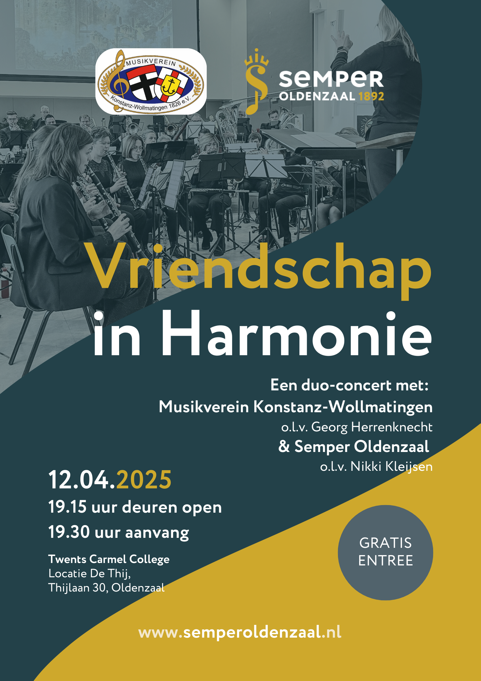 Onze vrienden van Musikverein Konstanz-Wollmatingen 1826 e.V. komen naar Nederland, en dat vieren we met een uniek gezamenlijk concert! Op zaterdagavond 12 april brengen wij samen om 19:30 uur een avond vol prachtige muziek in het Thijcollege in Oldenzaal! Wat kun je verwachten? Musikverein Konstanz-Wollmatingen o.l.v. George Herrenknecht speelt onder andere de sfeervolle Bodensee Polka […]